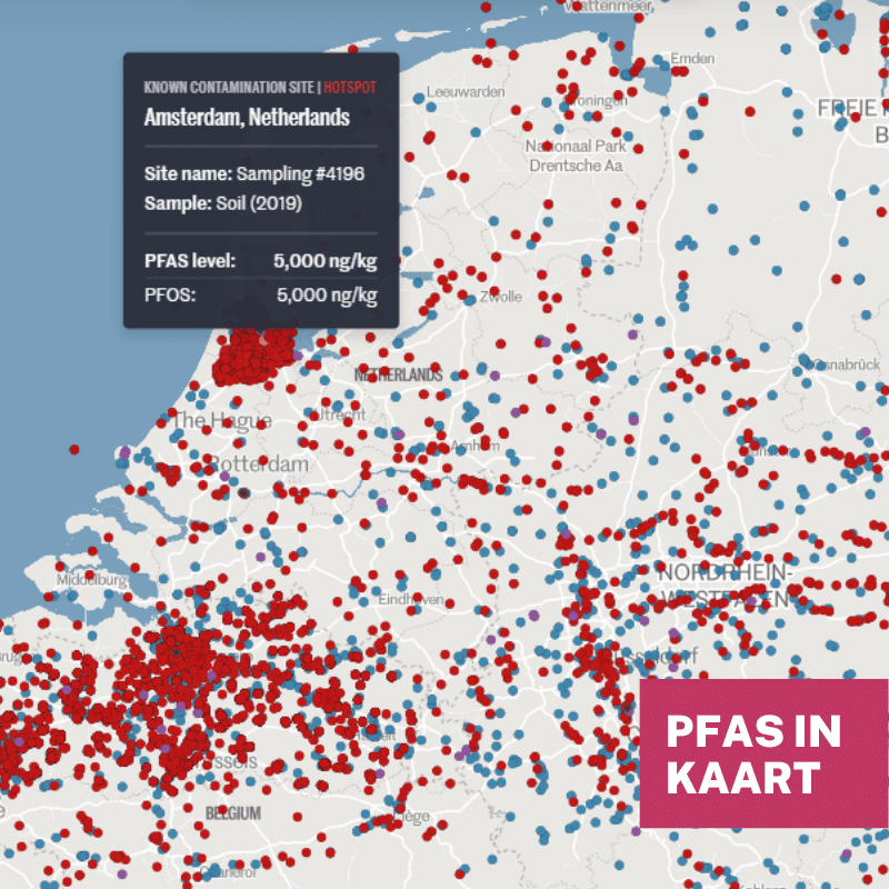 De kaart identificeert duizenden locaties in Nederland waar PFAS is aangetroffen of waar een zeer hoog risico op vervuiling bestaat. Grote industriële locaties (zoals rondom Amsterdam en Rotterdam) laten extreem hoge concentraties zien. Ook buiten de industriegebieden, in grondwater en oppervlaktewater nabij vliegvelden en stortplaatsen, worden de normen vaak overschreden.Â